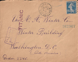 Over the decades a number of covers have been found that bear a "TITANIC" mark on them in 3 varieties. Sent from France, Denmark and Spain,